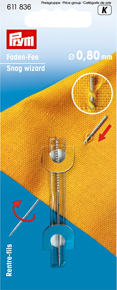- Die Faden-Fee ist eine 0,8 mm dünne Reparaturnadel mit der sich heraushängende Fäden problemlos beseitigen lassen. Diese spezielle Nadel hat statt eines Öhrs ein spiralartig geriffeltes Ende. Sie wird einfach direkt neben dem beschädigten Faden durch den Stoff oder das Gestrickte gestochen. Durch mehrfaches Drehen kann der Faden gegriffen und auf die Rückseite gezogen werden. So lassen sich kleinere Beschädigungen an der Kleidung ganz einfach reparieren.