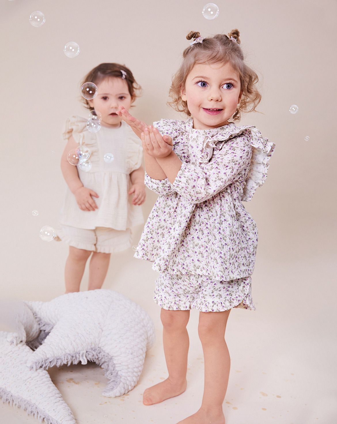Zauberhafte Sommerlooks für kleine Trendsetter: Die Tunika sitzt bequem, überzeugt mit aparten Volants und zartem Lavendelprint – in Uni wird das ärmellose Oberteil besonders schön betont. Dazu passen die Shorts in Vanilla-Creme mit Rüschen und Gummibund, die aus weichem Musselin angenehm zu tragen sind. Zusammen entsteht ein entzückender Zweiteiler, der Mini-Me’s spielend stylisch durch den Sommer begleitet.