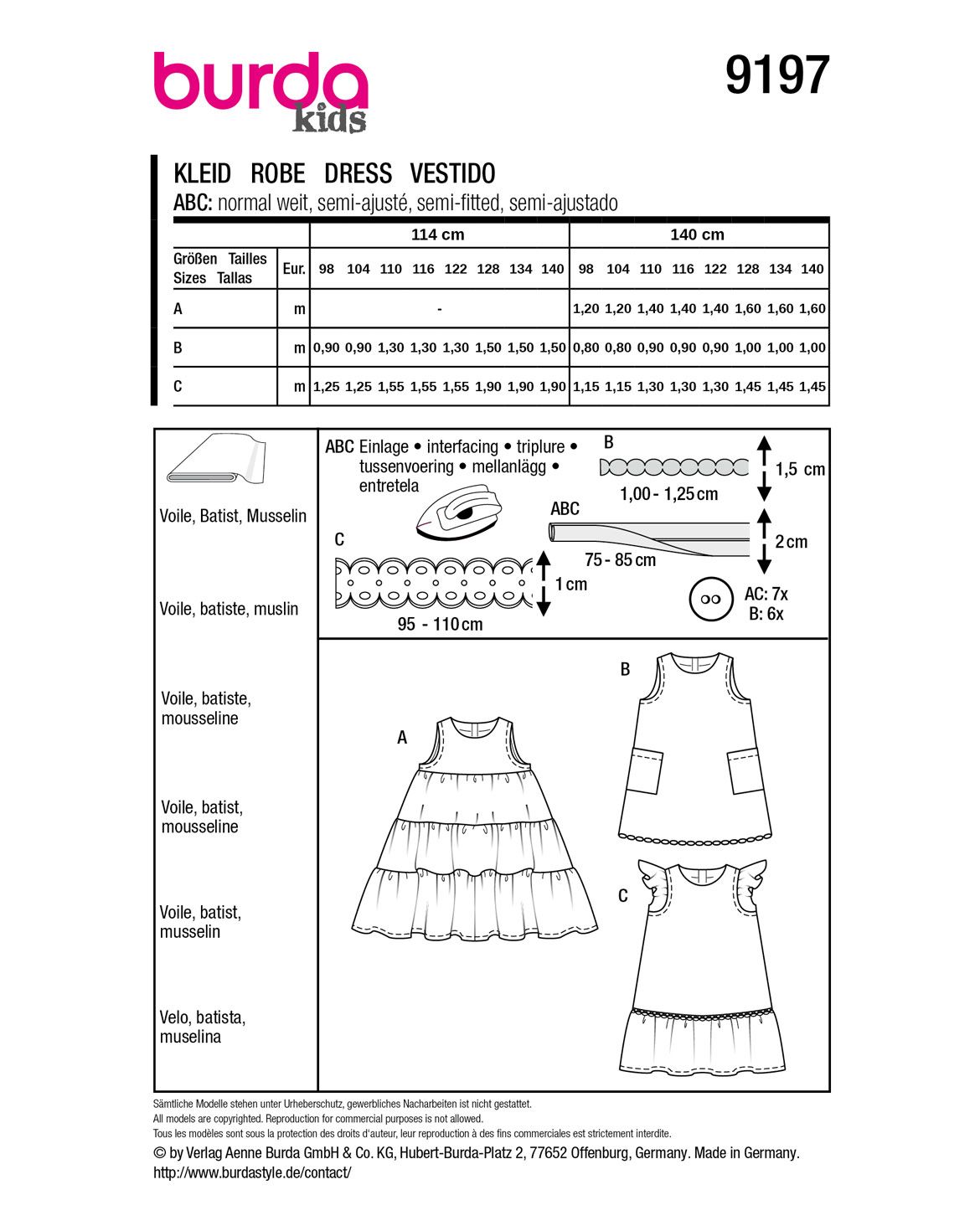 Empfohlener Stoff: Batist, Musselin, Voile