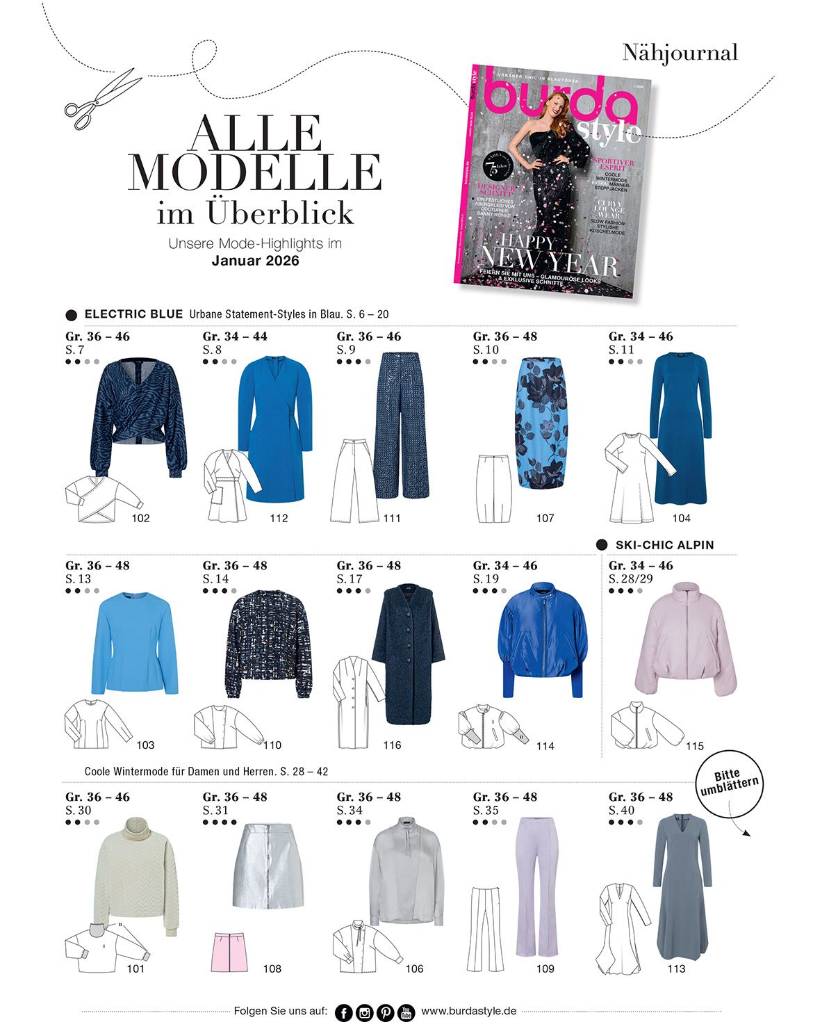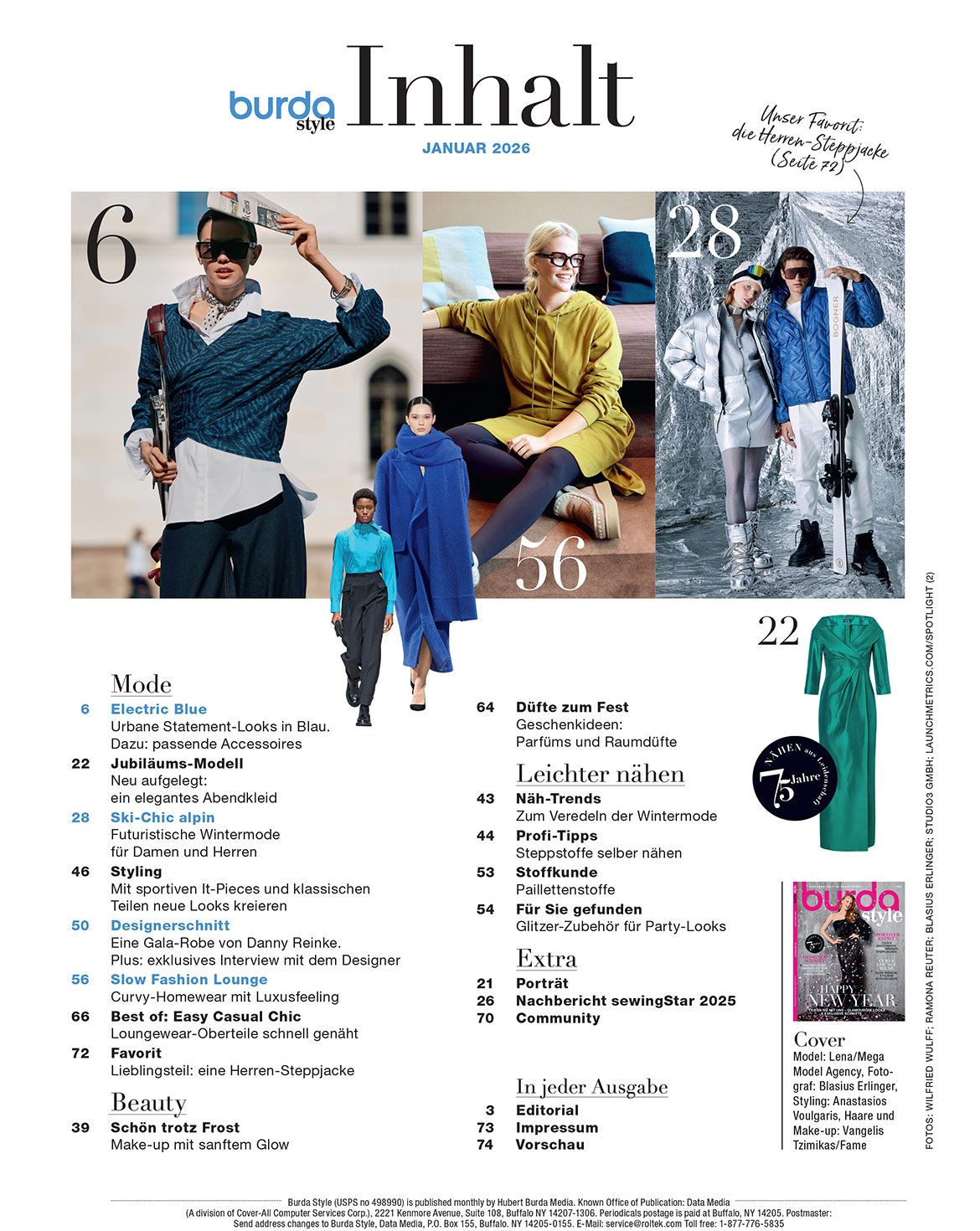 Die neue burda style feiert den Start ins Jahr 2026 mit 29 modernen Schnittmustern, frischen Trendfarben und vielseitigen Designs. Ob urbane Fashion, alpine Wintermode oder elegante Abendkleider – diese Ausgabe zeigt, wie kreativ, wandelbar und inspirierend Mode zum Jahresbeginn sein kann.