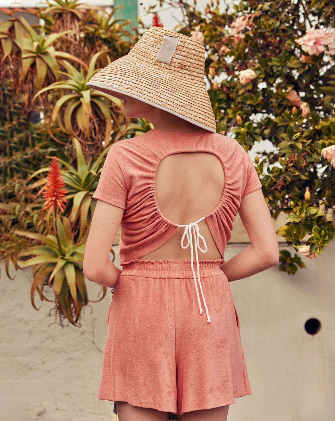 Sommerliche Basics mit Stil: ein leicht verkürztes Rundhals-Shirt, das puristisch wirkt, sich aber durch XL-Rückenausschnitt und geraffte Kordel hinten raffinierte Details holt, sowie Shorts mit Gummizug und Hüftpassentaschen für bequemen, luftigen Sitz. Zusammen ergeben die Teile einen entspannten, aber trendigen Zweiteiler für warme Tage.