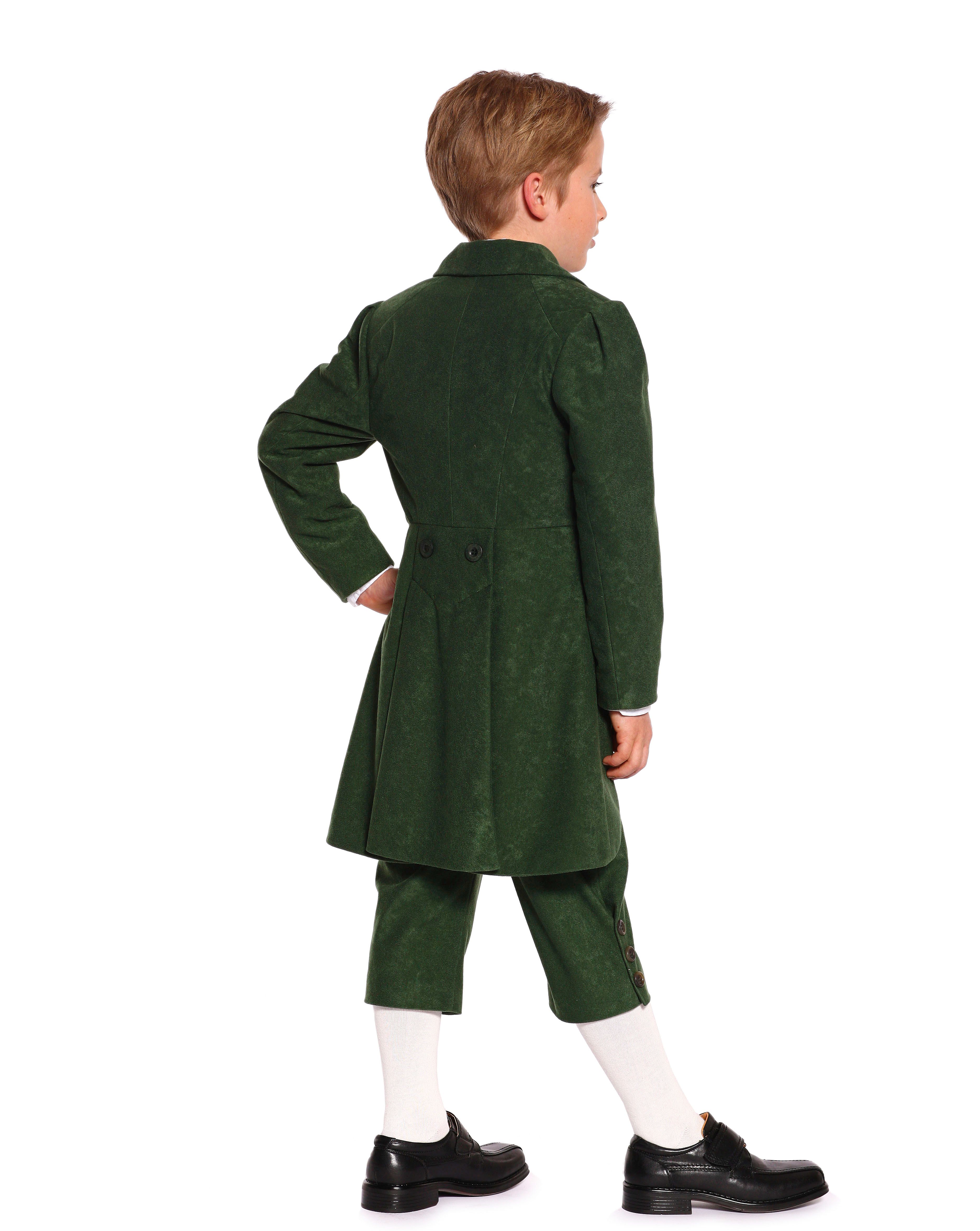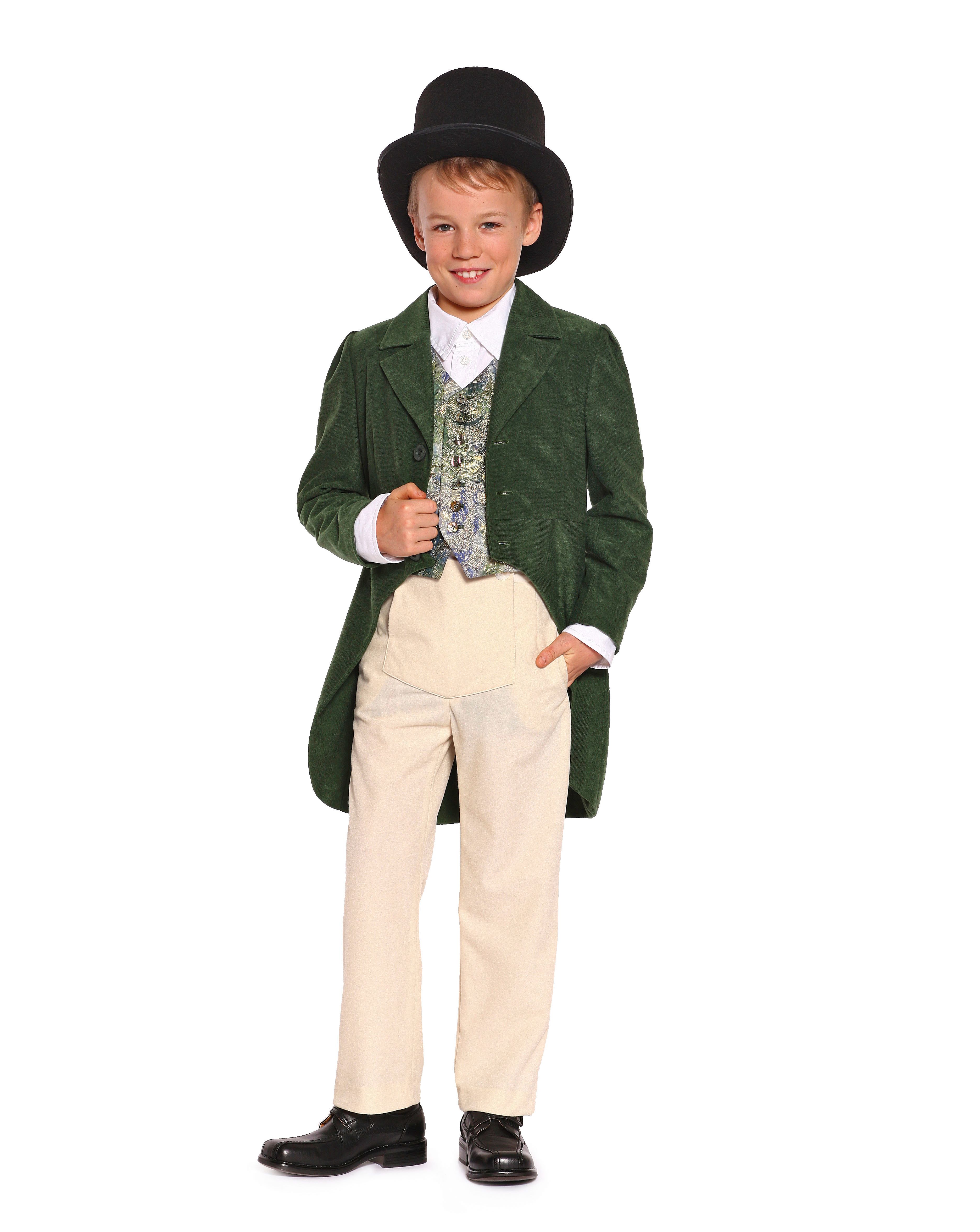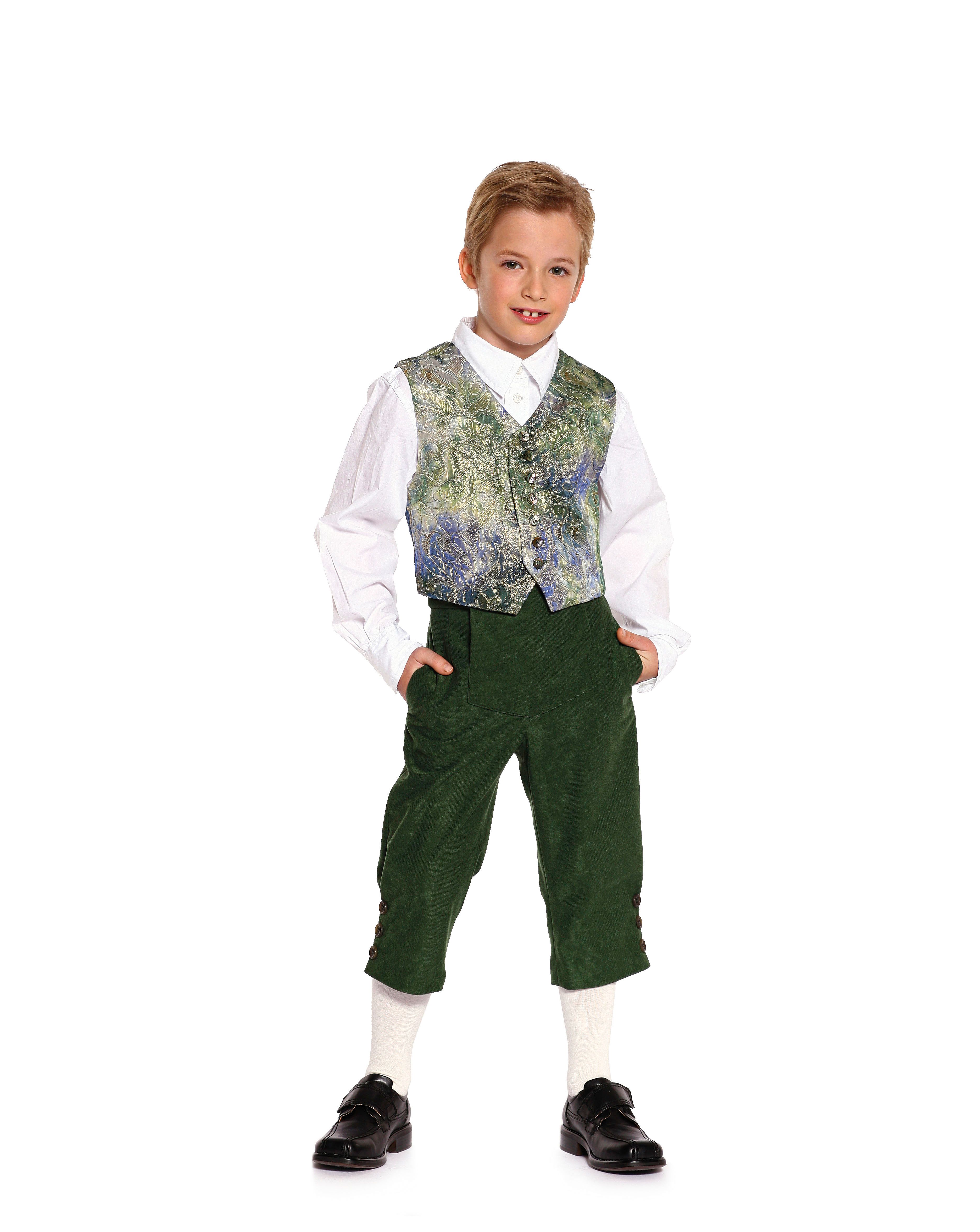Stilechter Anzug aus der Biedermeier-Zeit. Jacke A mit Revers und Frackschösschen. Dazu wahlweise Hose C oder D in zweierlei Längen mit geknöpftem Hosenladen. Weste B aus edlem Stoff vervollständigt die noble Kombination.