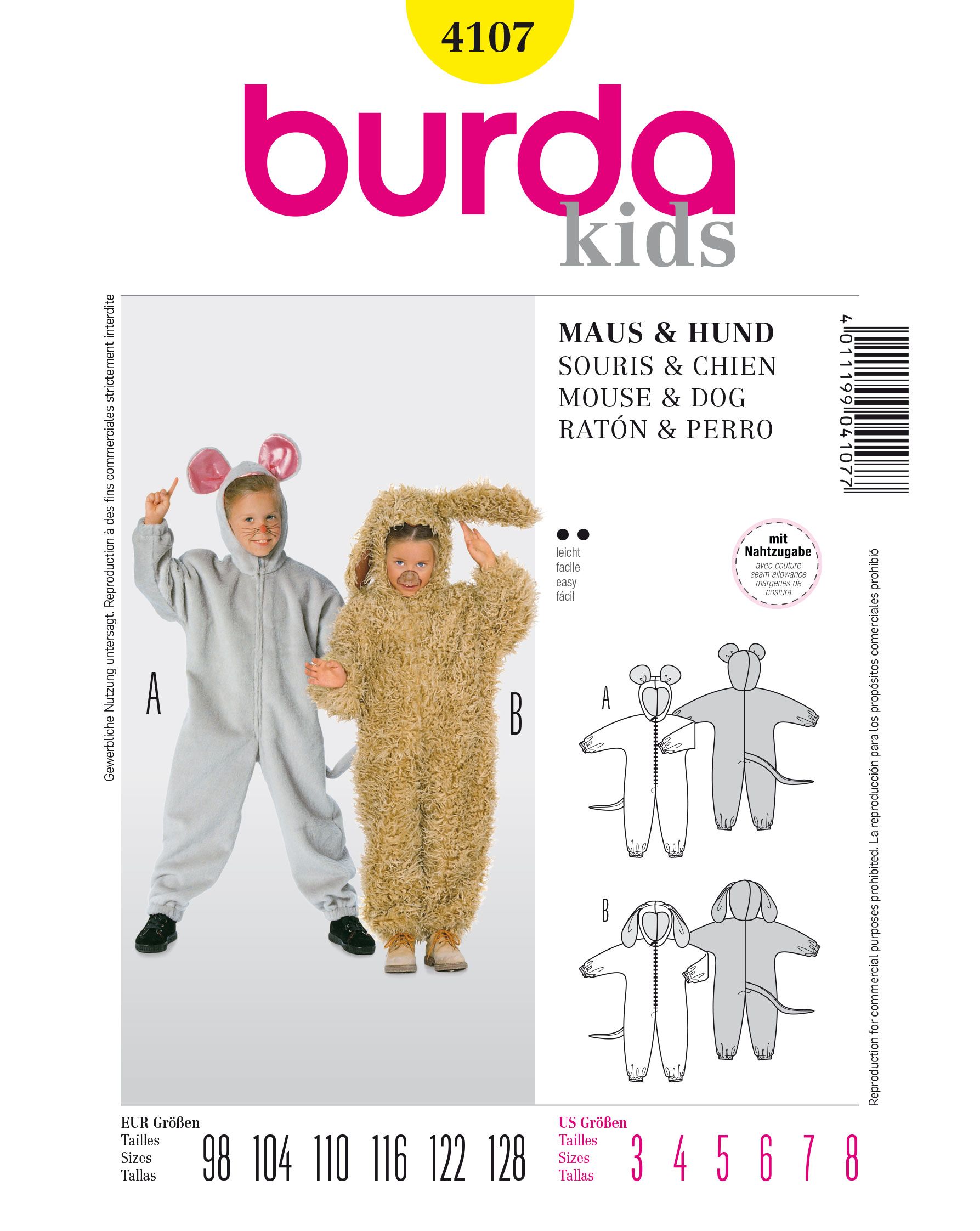 Overall, sehr weit, mit Reissverschluss, Gummizugbündchen und Kapuze. A mit Maus-Ohren, B mit Dackel-Ohren.