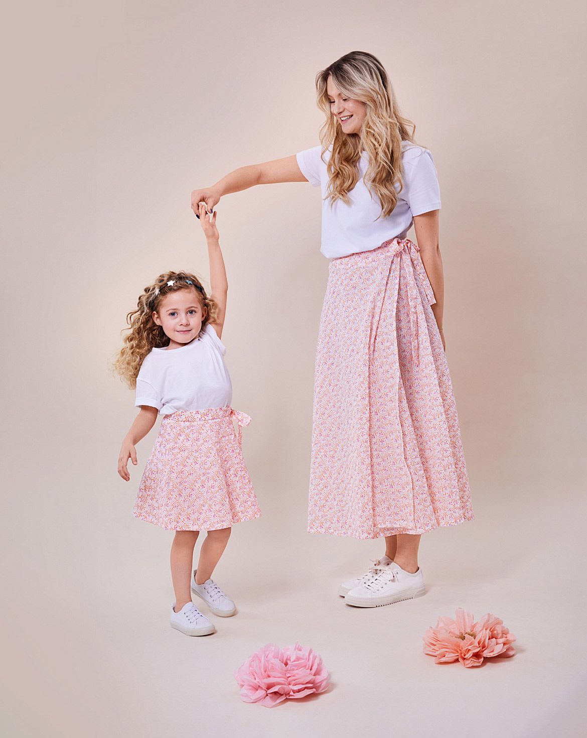 Sommerliche Wickelröcke für kleine Fashionistas: Der erste Rock besticht durch florale Verspieltheit, ist bequem zum Toben und kommt auch in Mamas Größe. Die zweite Variante zeigt einen leicht gerüschten Saum und eine hübsche Schleife – ein sommerliches Lieblingsstück, das Anmut und Lässigkeit perfekt kombiniert.