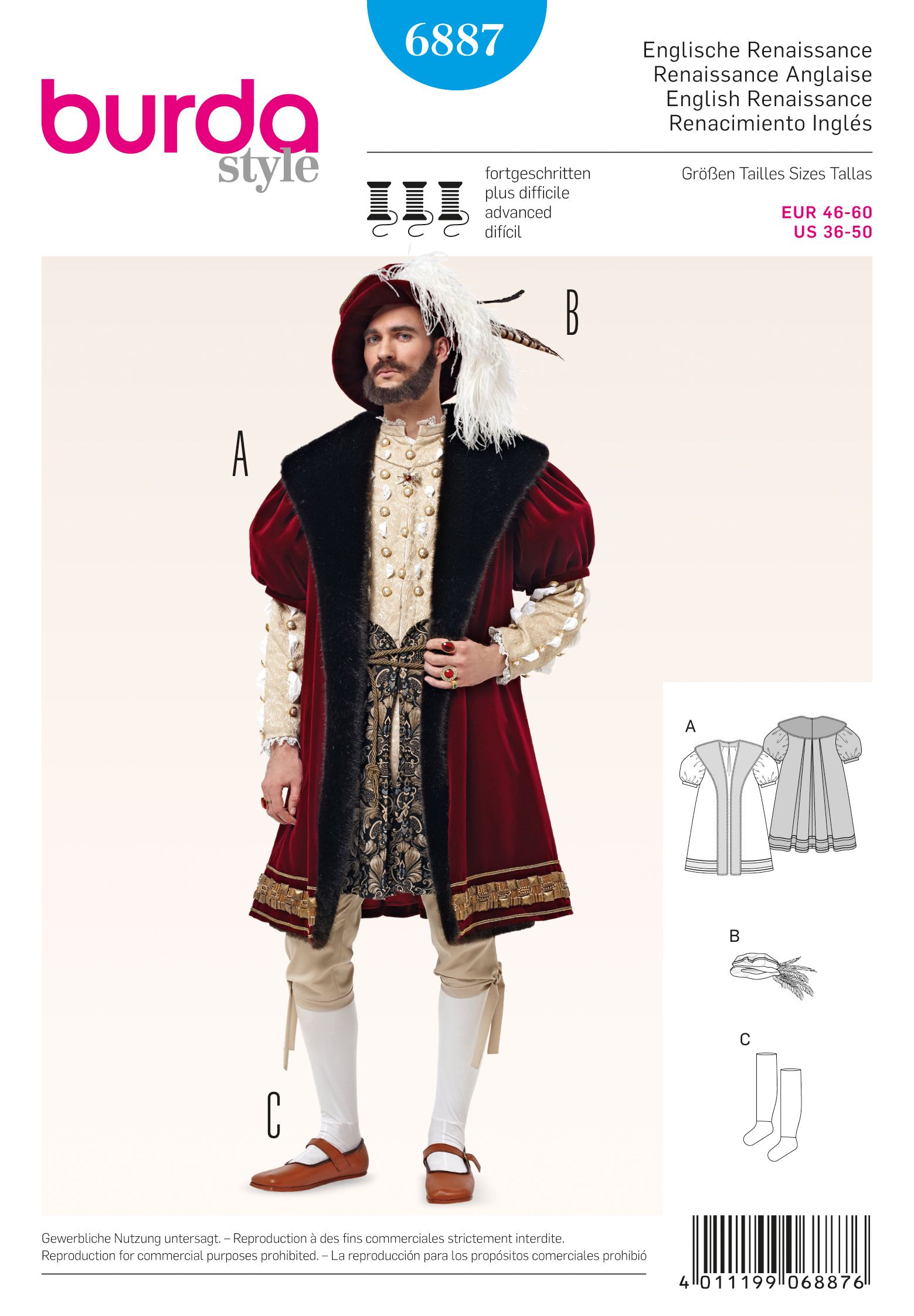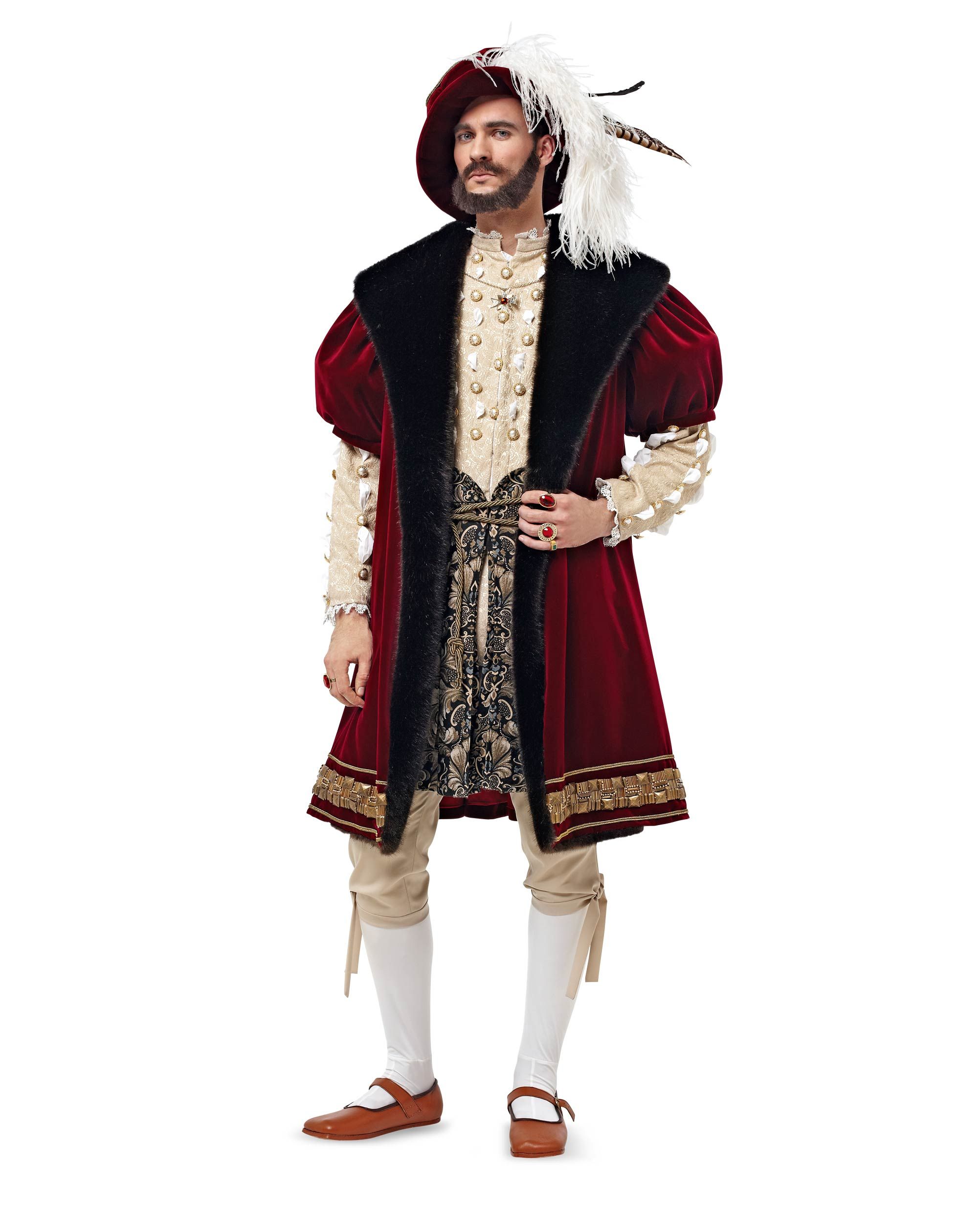 Prunkvoller Mantel und passender Hut im Stil der englischen Renaissance, dem Zeitalter Shakespeares. Kostbare Stoffe, Fellimitat, Borten und Federn kommen zum Einsatz. Selbst die Strümpfe sind selbst genäht. Das Darunter und die Kniebundhose finden Sie unter der Schnittnummer 6888. Stoffempfehlung: AB: Samt A Garniturstoff: Fellimitat C: Bi-elastischer Jersey