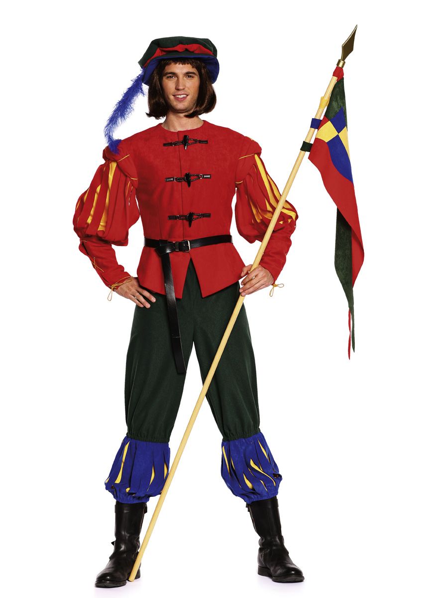Mittelalterlicher Landsknecht mit kräftigen Farben, starken Kontrasten und unterlegten Schlitzen an Ärmeln und Hosenbeinen. Die breite Kordelschnürung an den Manschetten ist ein zusätzlicher Blickfang. Ein auffälliger Hut mit Krempe und Feder machen Ihren Auftritt komplett.