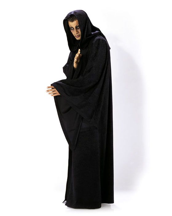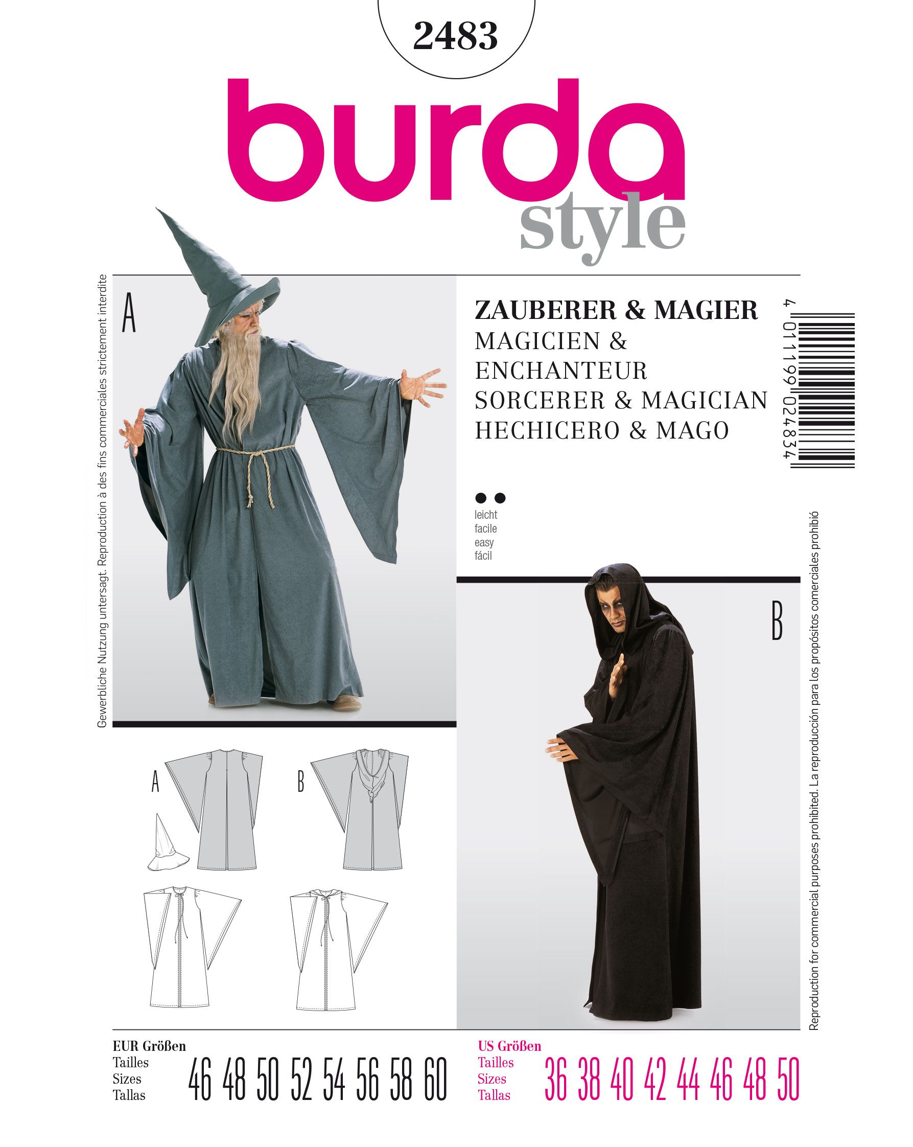 Diese beiden Faschingskostüme oder Halloweenkostüme passen zu klassischen Fantasy-Themen. Hier ein Zauberer oder Hexenmeister. Einmal ein Mantel mit Hut und einmal dafür mit grosser Kapuze. Der Mantel hat eine Kellerfalte im Rücken und trompetenförmige Ärmeln.