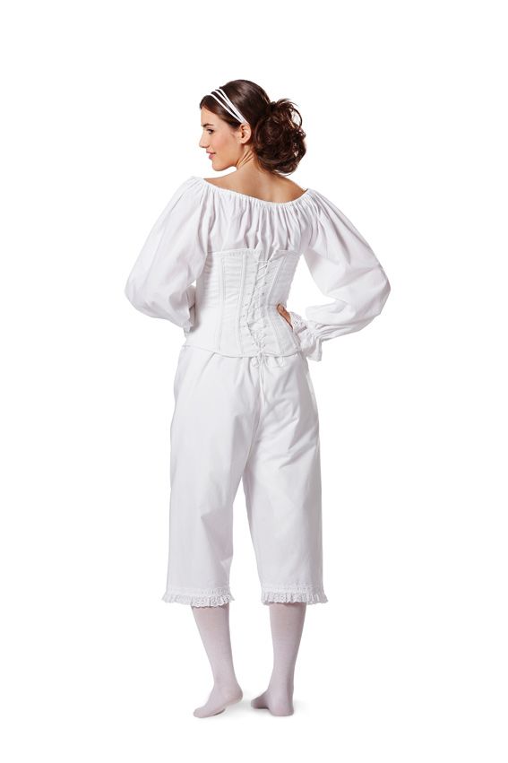 Hier finden Sie das passende Darunter für Ihre mittelalterlichen Gewänder: langes, an Ausschnitt und Ärmeln gerafftes Hemd sowie ¾ lange Unterhose, die aus separaten Hosenbeinen besteht und nur durch das Taillenbändchen zusammengehalten wird. Das enge Mieder mit Stäbchen wird im Rücken geschnürt und vorn mit Haken und Ösen geschlossen.