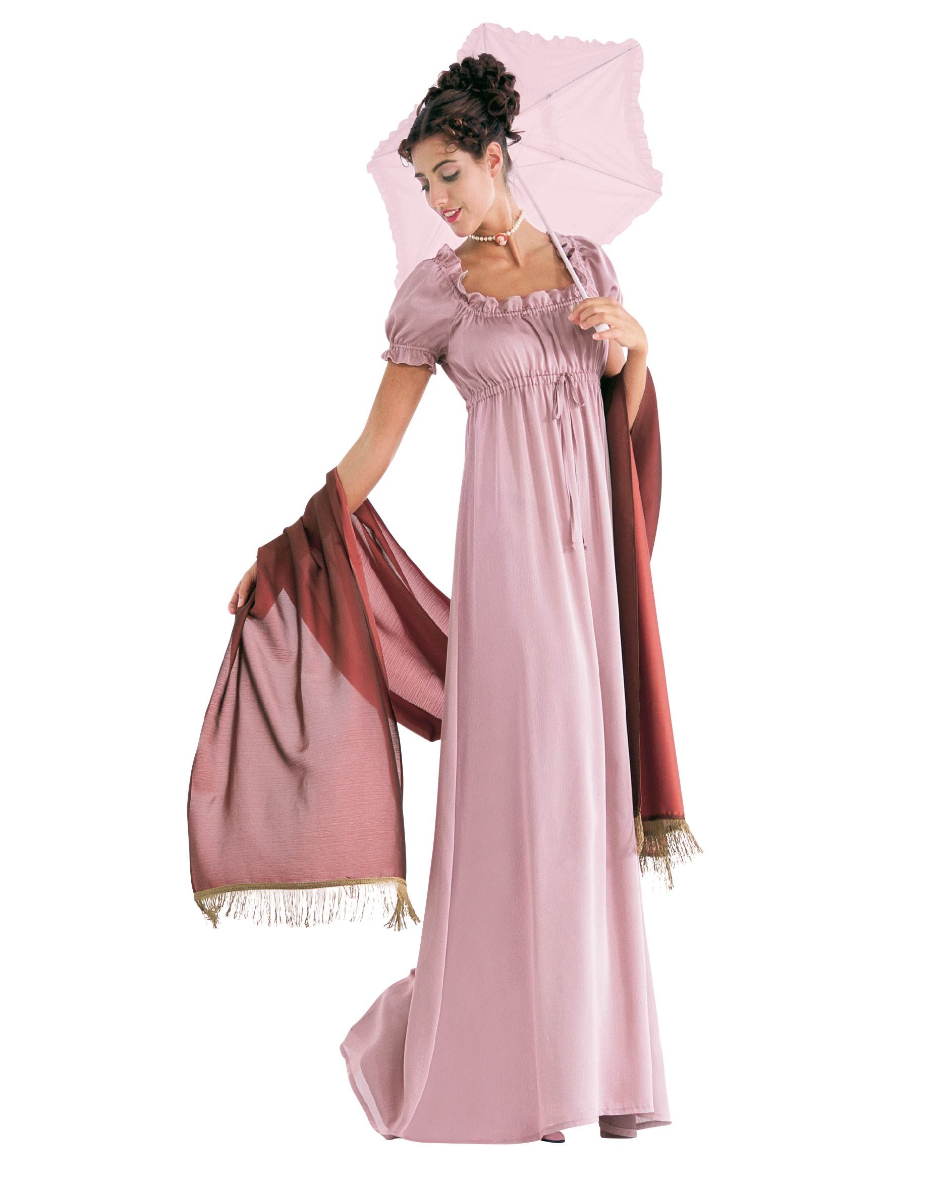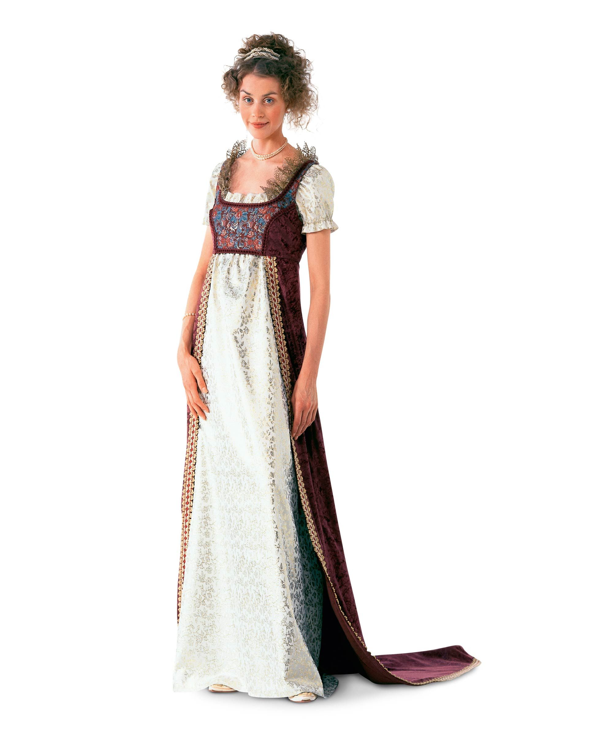 Empire-Kleid (Josephine), bestehend aus einem Überkleid (A) mit kurzem Mieder-Oberteil, vorn geteilter Rockbahn und rückw. Schleppe. Darunter ein Kleid (B) im Wäschestil mit Puffärmeln und Banddurchzug. Das Kleid kann auch solo getragen werden, dazu der Schal mit Fransenborte (C).