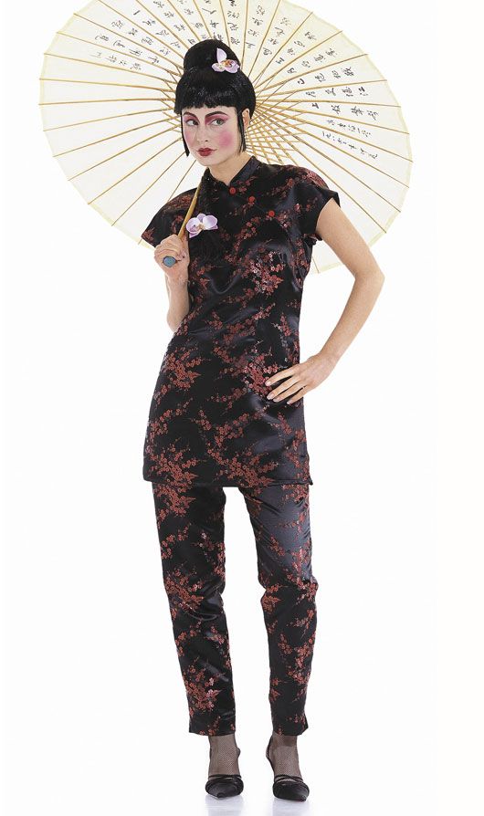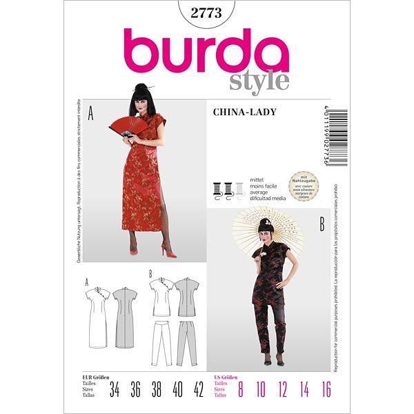 Ob als langes, geschlitztes Kleid A oder als 2-Teiler B mit schmaler, geschlitzter Hose. Dieses Kostüm garantiert Ihnen einen glanzvollen Auftritt im Asia-Look.