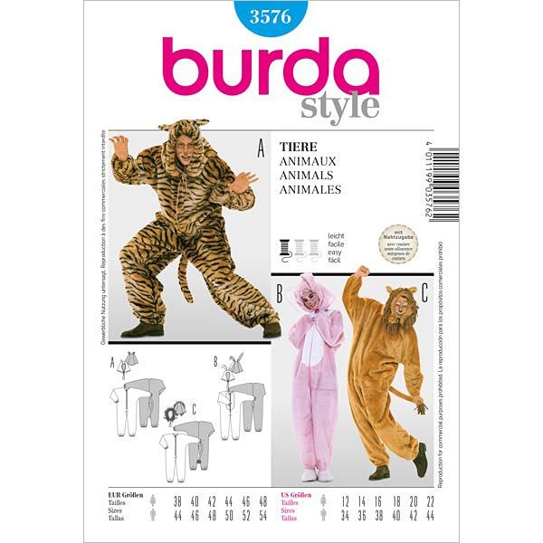 Overall, sehr weit, mit angeschnittenen Ärmeln und Gummizugbündchen. Dazu separate weite Kapuze für Wildkatze, Löwe bzw. Hase.