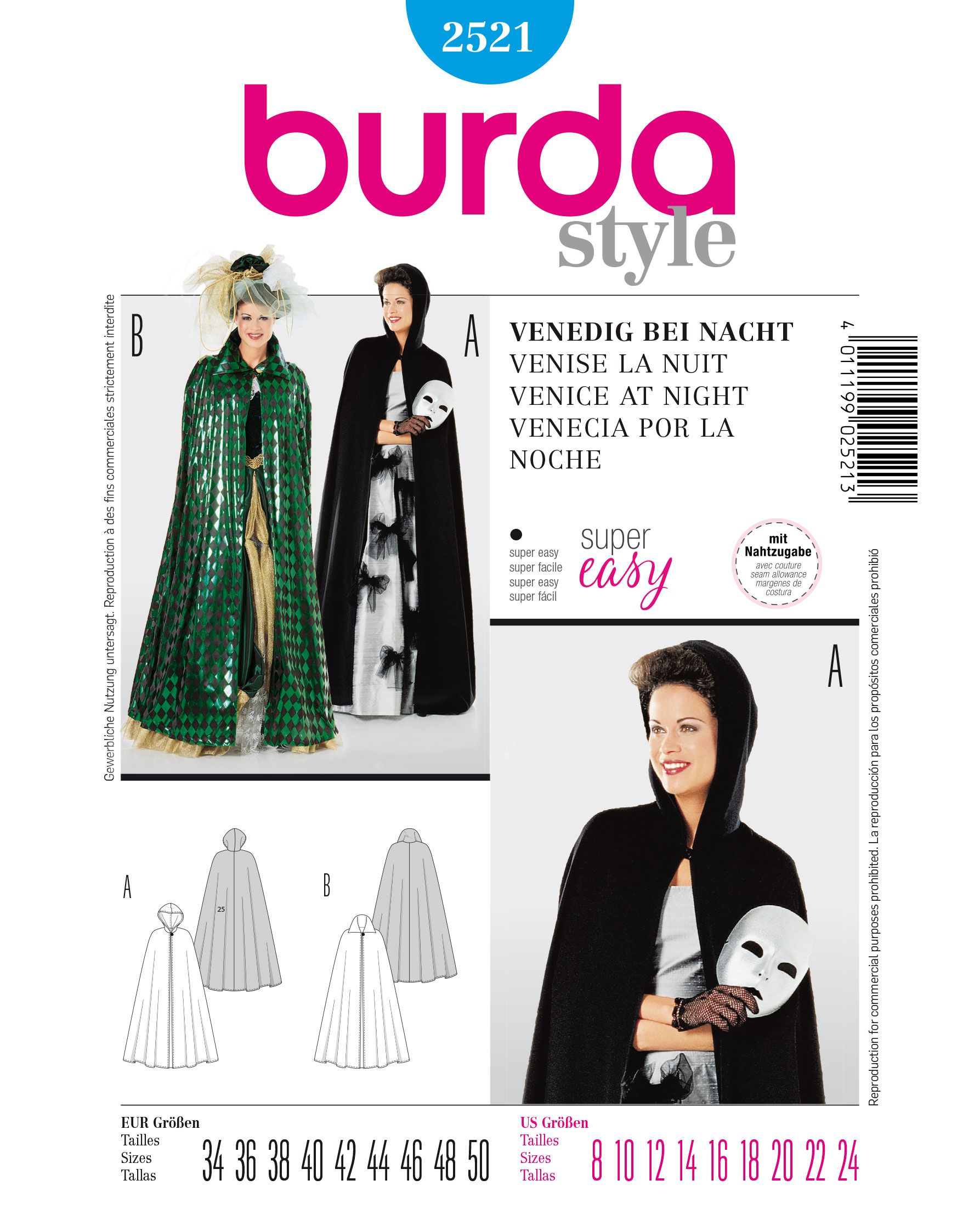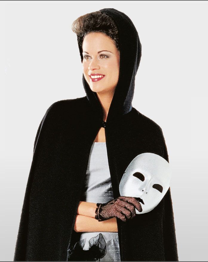 Bodenlanges Cape, A mit Kapuze, B mit Kragen zum Hochstellen, jeweils mit einem Knopf geschlossen. Das Thema für den Fasching, die Kostümparty oder Halloween ist der Maskenball? Mit diesem Kostüm "Venedig bei Nacht" wird der Zauber der Verkleidung geweckt.