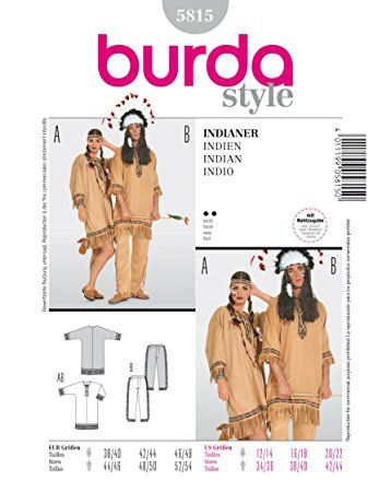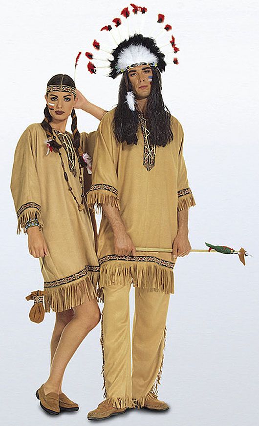 Hemd und Gummizughose, sehr weit, mit Kordelschnürung und typischer Indianer-Verzierung aus Borten und Fransen. A knielanges Kleid für Damen. B Hemd und Hose für Herren.