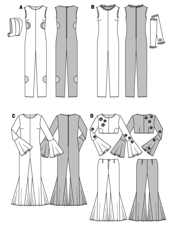 ABC Overall, D Top, E Hüfthose, jeweils eng anliegend. Sexy, flippig, spacy oder Flower-Power - alles in einem Schnitt.