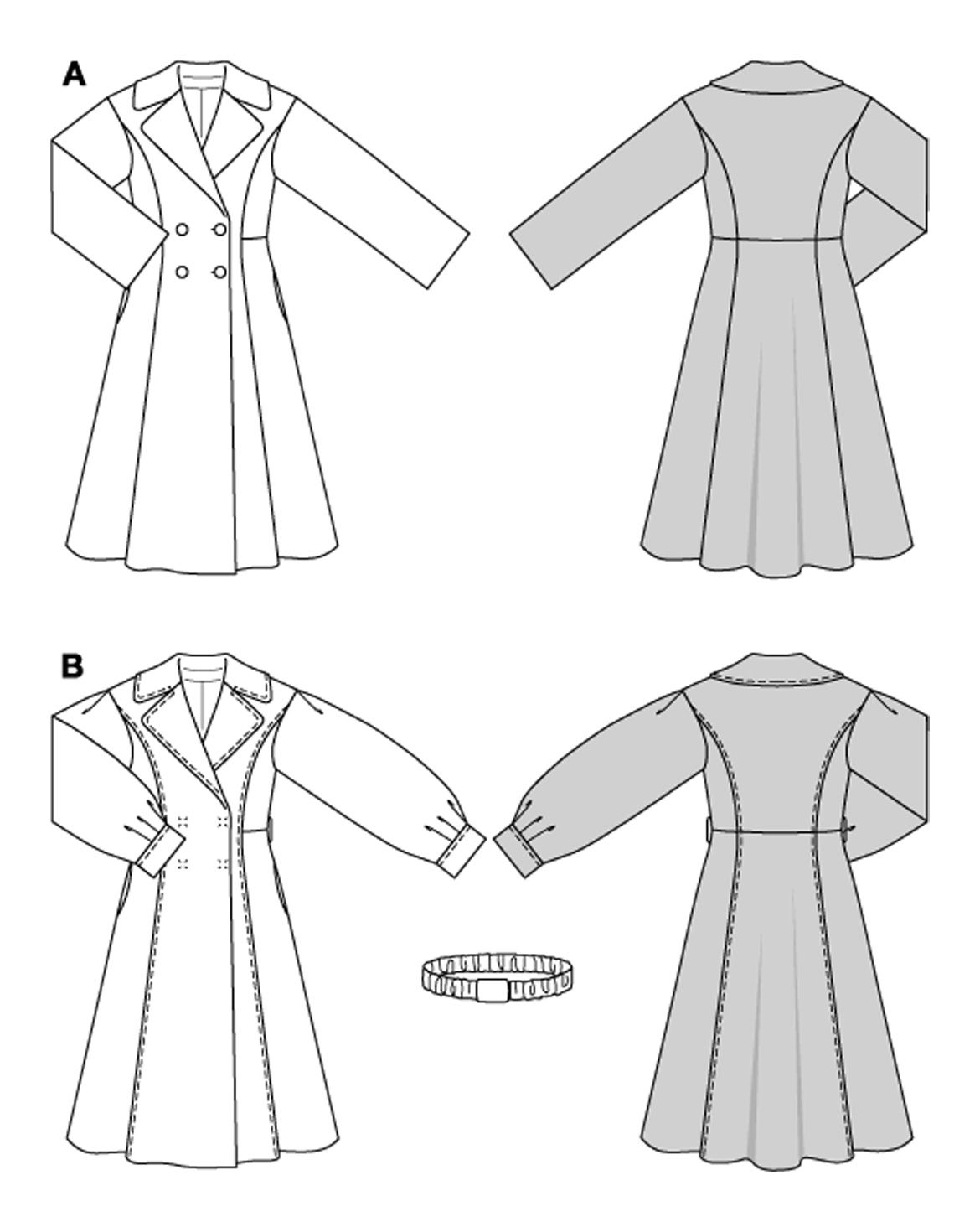 Entdecke zwei edle Mantelschnittmuster, die für Aufsehen sorgen! Das erste Schnittmuster formt durch überschnittene Schultern, eine schmale Taille und ein weit ausgestelltes Rockteil eine traumhafte Sanduhr-Silhouette. Praktisch: tiefen Nahttaschen und weite Ärmel. Der zweite Schnitt wirkt auf den ersten Blick cool wie ein Trenchcoat, begeistert aber mit femininen Details wie einem XL-Kragen und voluminösen Ärmelbündchen. Diese Modelle erfordern etwas Näherfahrung.