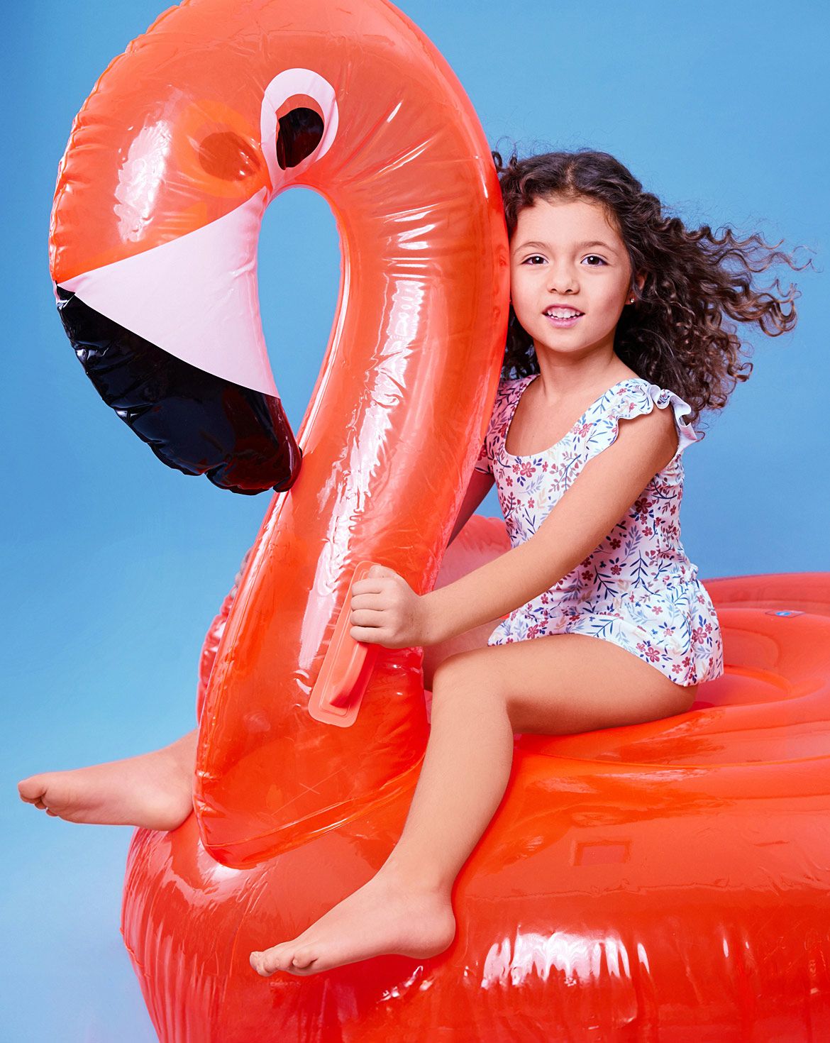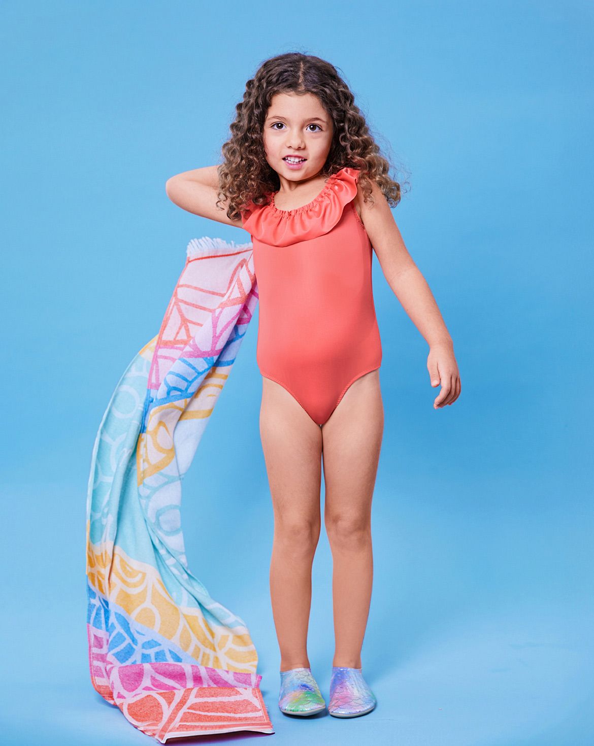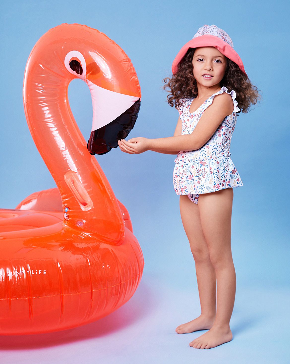 Sommerliche Bade-Looks für kleine Wasserratten: Das erste Teil ist ein korallfarbenes Lycrashirt mit Volant am Ausschnitt – angenehm auf der Haut und ein echter Hingucker. Der zweite Anzug in Blümchen-Optik erhält durch Schößchen und Rüschen an den Armausschnitten eine romantische Note und wird zum aparten Badekleid. Abgerundet wird das Set durch eine lässige, wendbare Südwester-Kopfbedeckung mit Zwei-Farben-Design – perfekt für Strandtage und Sonnenschutz.