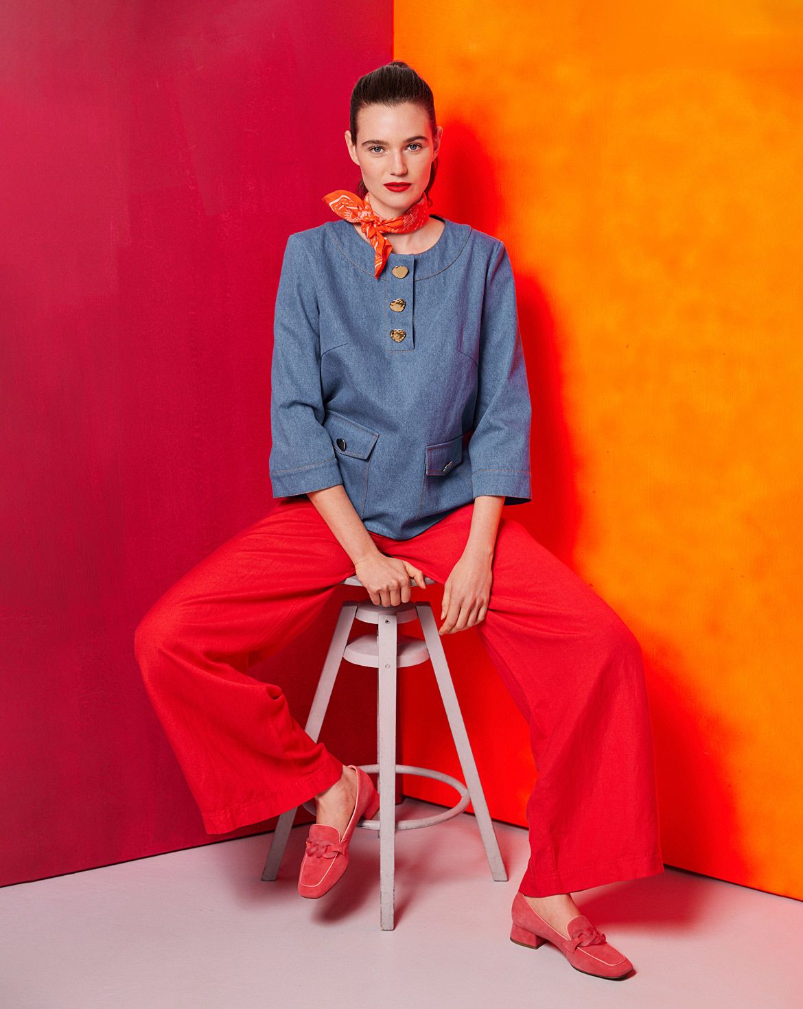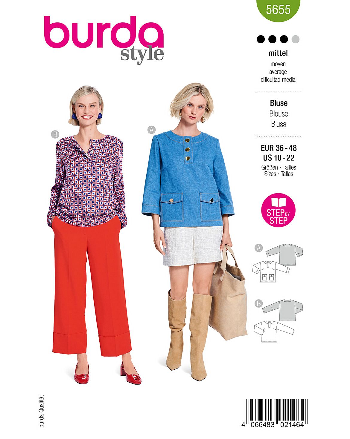 Setze auf starke Kontraste mit diesen Blusen! Die erste Variante besticht durch XL-Knöpfe, XL-Pololeiste und XL-Taschen – dazu Nähte in kontrastfarbenem Garn für den Denim-Look. Das zweite Modell kombiniert Polo-Schnitt mit Blusenstoff, puristische Details wie Ausschnittblende und Druckknöpfe lassen aufregende Prints perfekt zur Geltung kommen. Ideal für moderne, statementstarke Outfits.