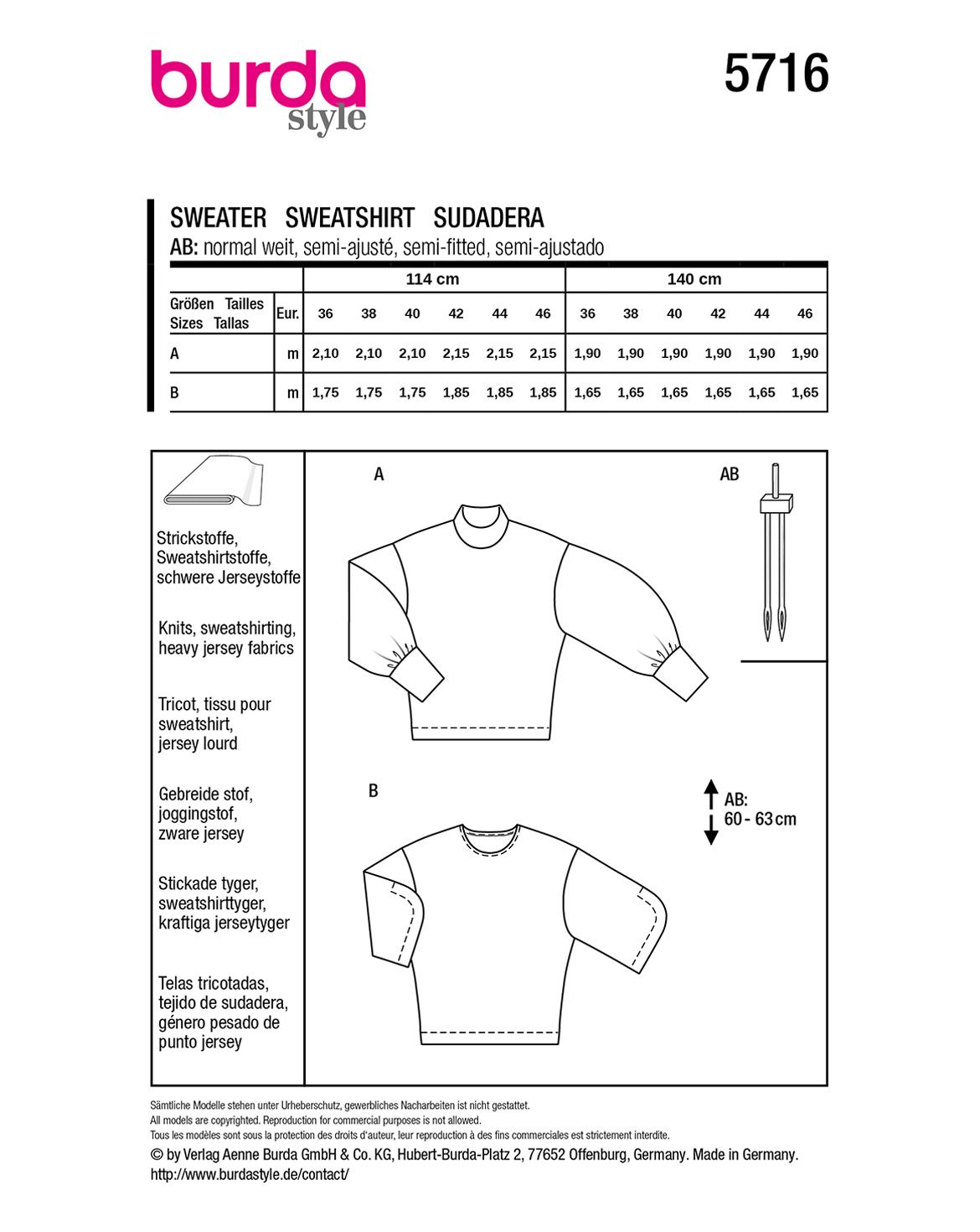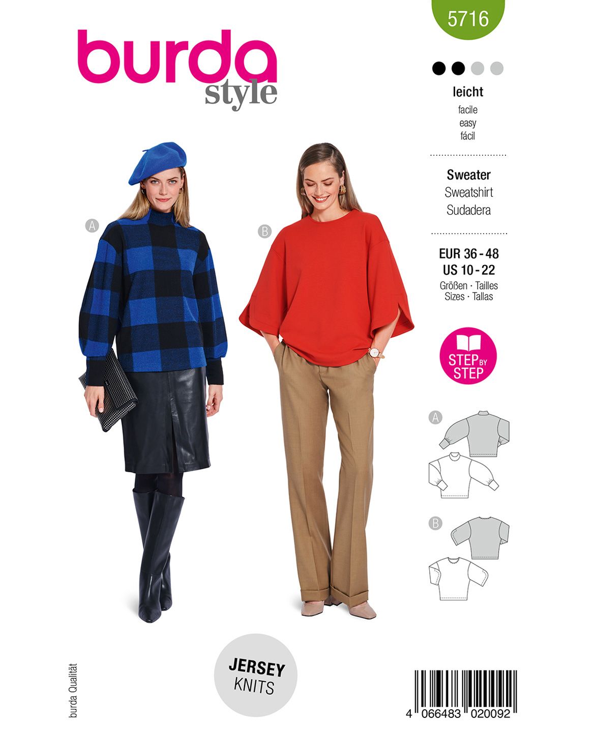 Entdecke zwei trendige Sweatshirt-Varianten in einem Schnittmuster! Variante 1 besticht durch supervoluminöse Ärmel und lange, schmale Bündchen – bequem und stylisch zugleich. Schnitt-Variante 2 bringt mit abgerundeten Säumen und weitem Schnitt frischen Wind in deinen Kleiderschrank. Nähe beide Looks aus Strickstoff, Sweatshirtstoff oder Jerseystoff!