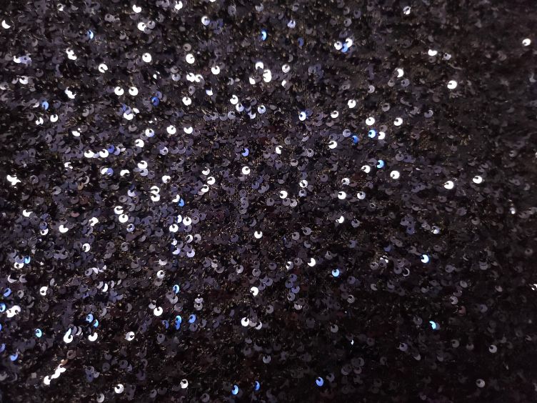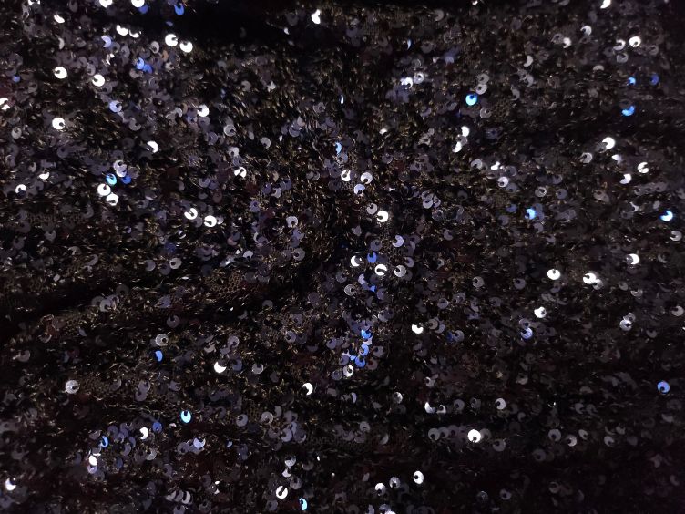 Dunkelblauer Paillettenstoff auf Tüllgrund.
