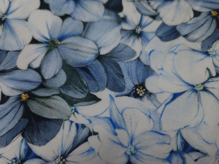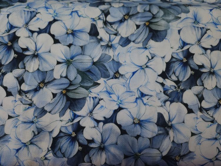 Weich fallender Viskosestoff mit Blumenmeer in blau.